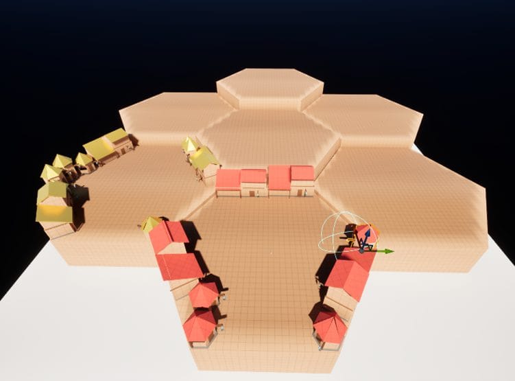 My goal here was to begin actually setting out the layout of each node and taking the concepted gameplay and level design and put it in Engine. I made a few static mesh assets for the houses (can’t wait to get some artists on that.) I made some color choices that mimic a color wheel. The overall color accents for each region will be red for the military section, yellow for the coin section and purple for the academic section. Finally, the castle itself will have blue accenting so that they mimic the poles of the color wheel and still take some symbolism from the colors themselves. As a reminder the lowest tier is intended to be a residential section, the mid-tier is the commercial section and then the upper most tier is the castle itself.