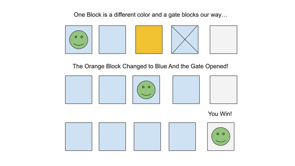 - The gateway mechanic functions by having a “trigger” tile targeting a “door” tile and checking to see if the player character is present on the trigger tile. If so, the trigger tile then changes the door tile to “can enter” and changes the color of both tiles to green.